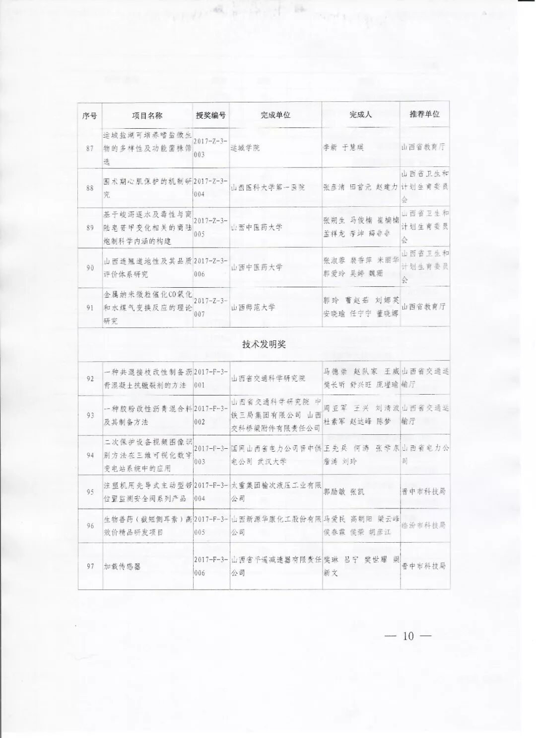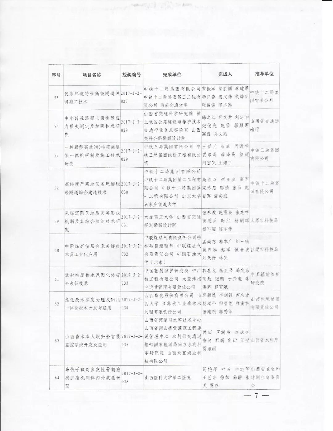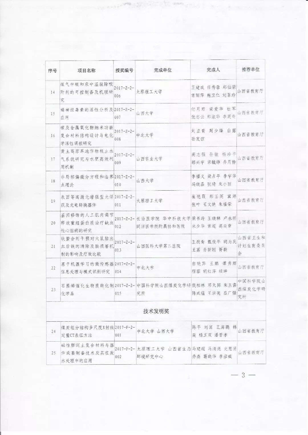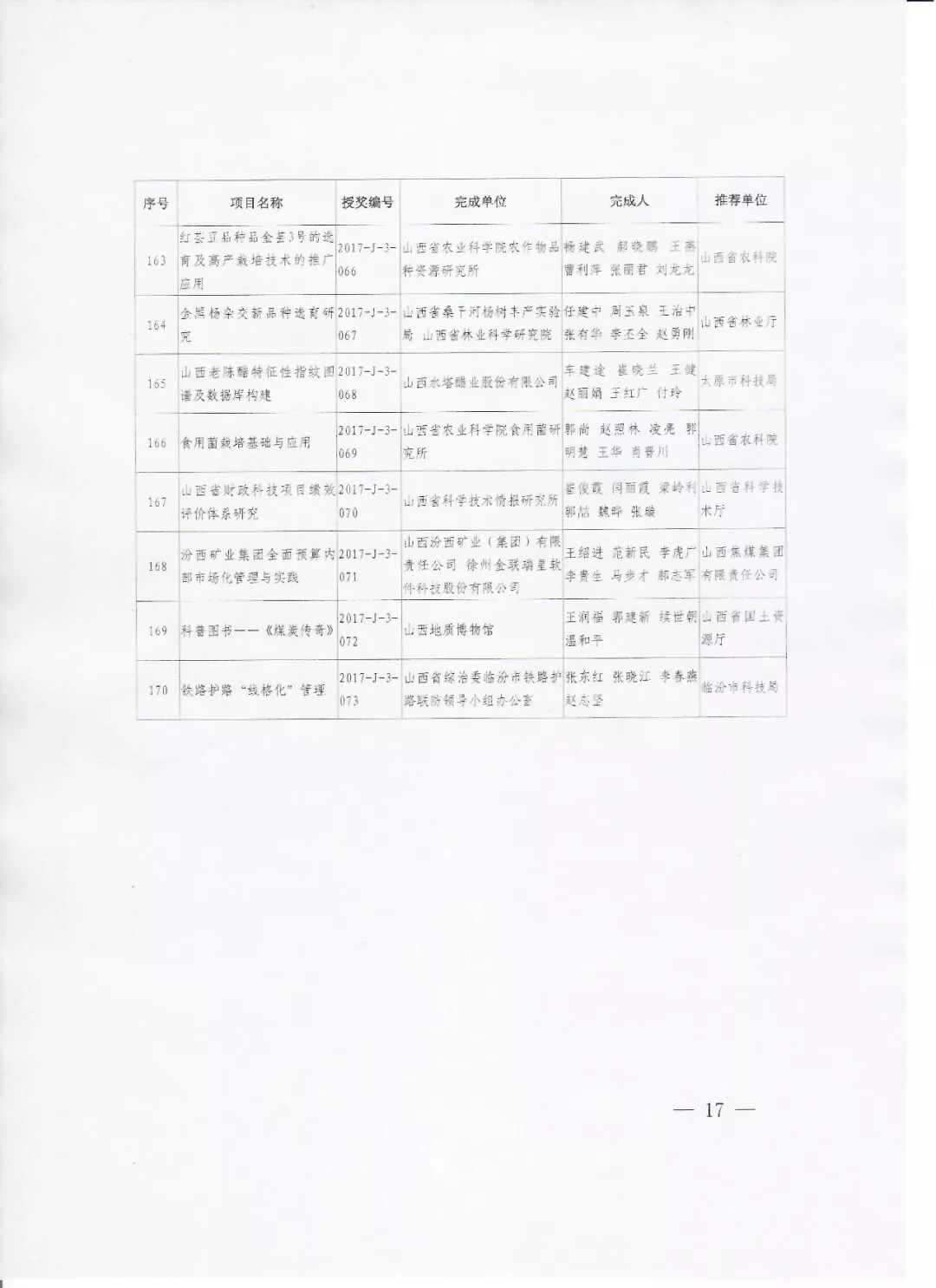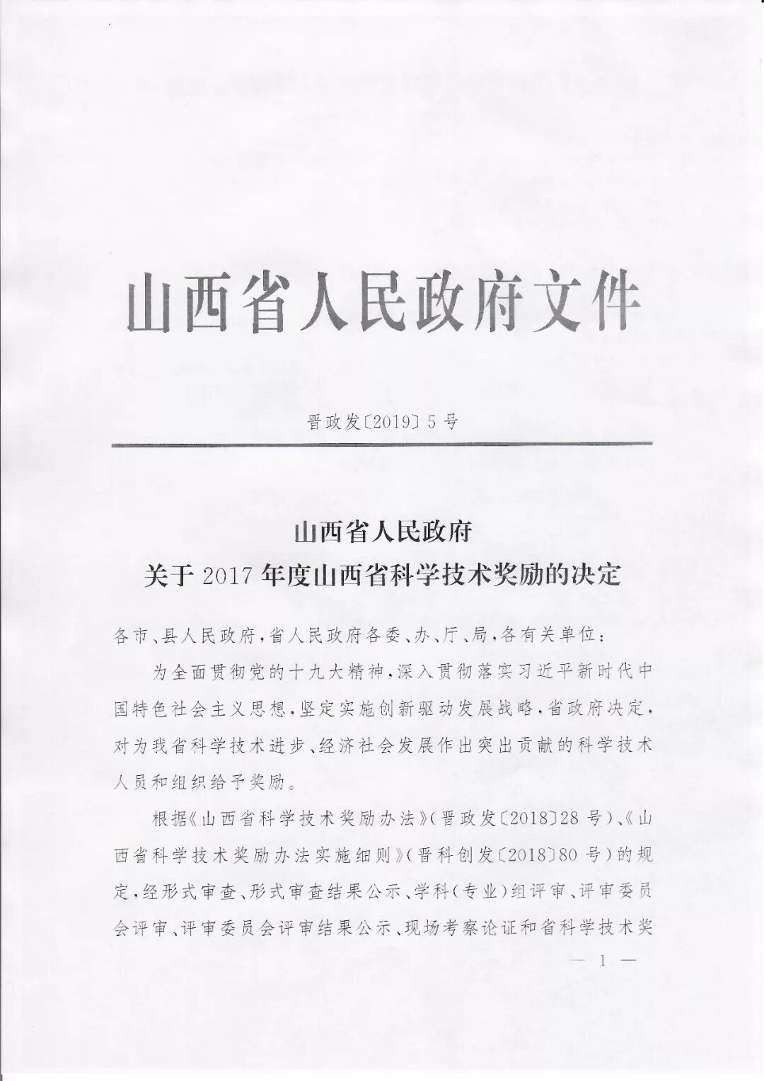 山西省人民政府 关于2017年度山西省科学技术奖励的决定