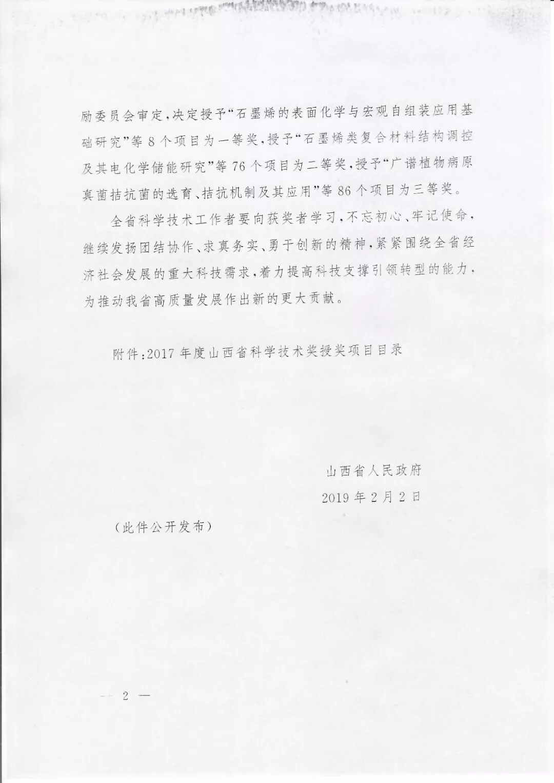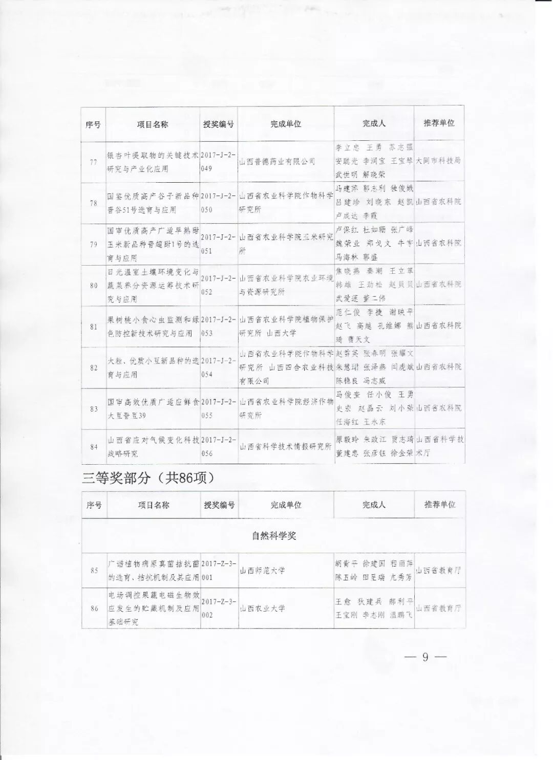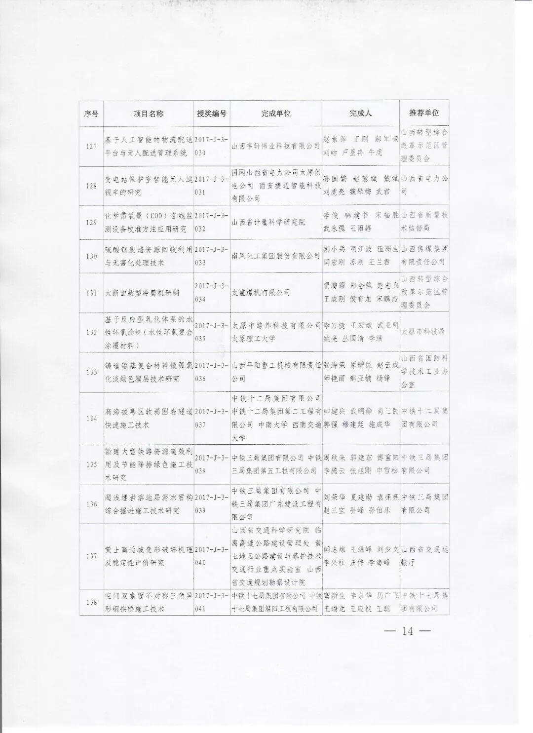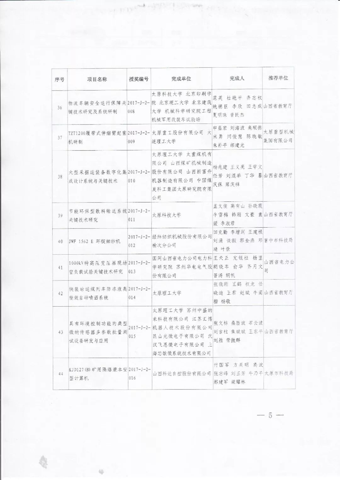 山西省人民政府 关于2017年度山西省科学技术奖励的决定