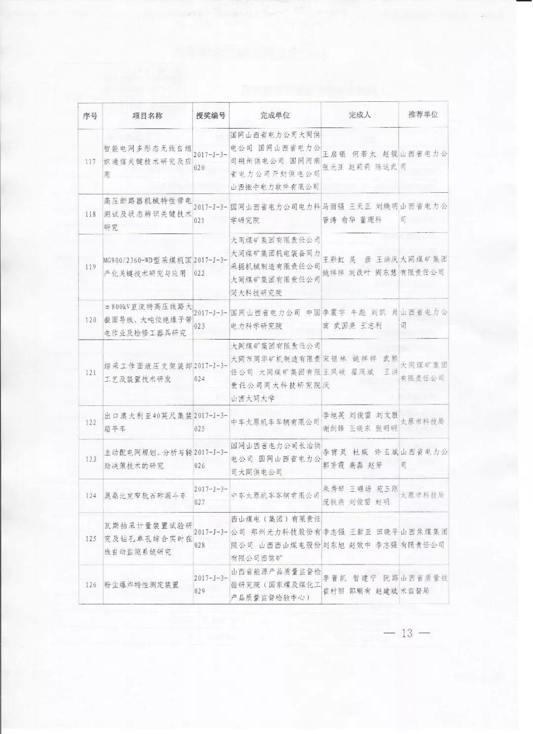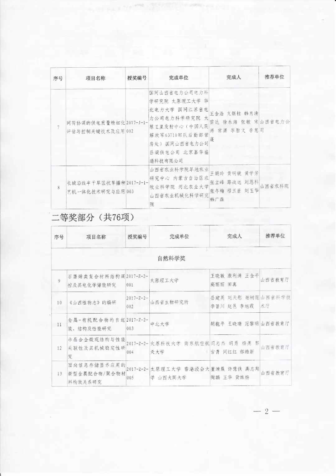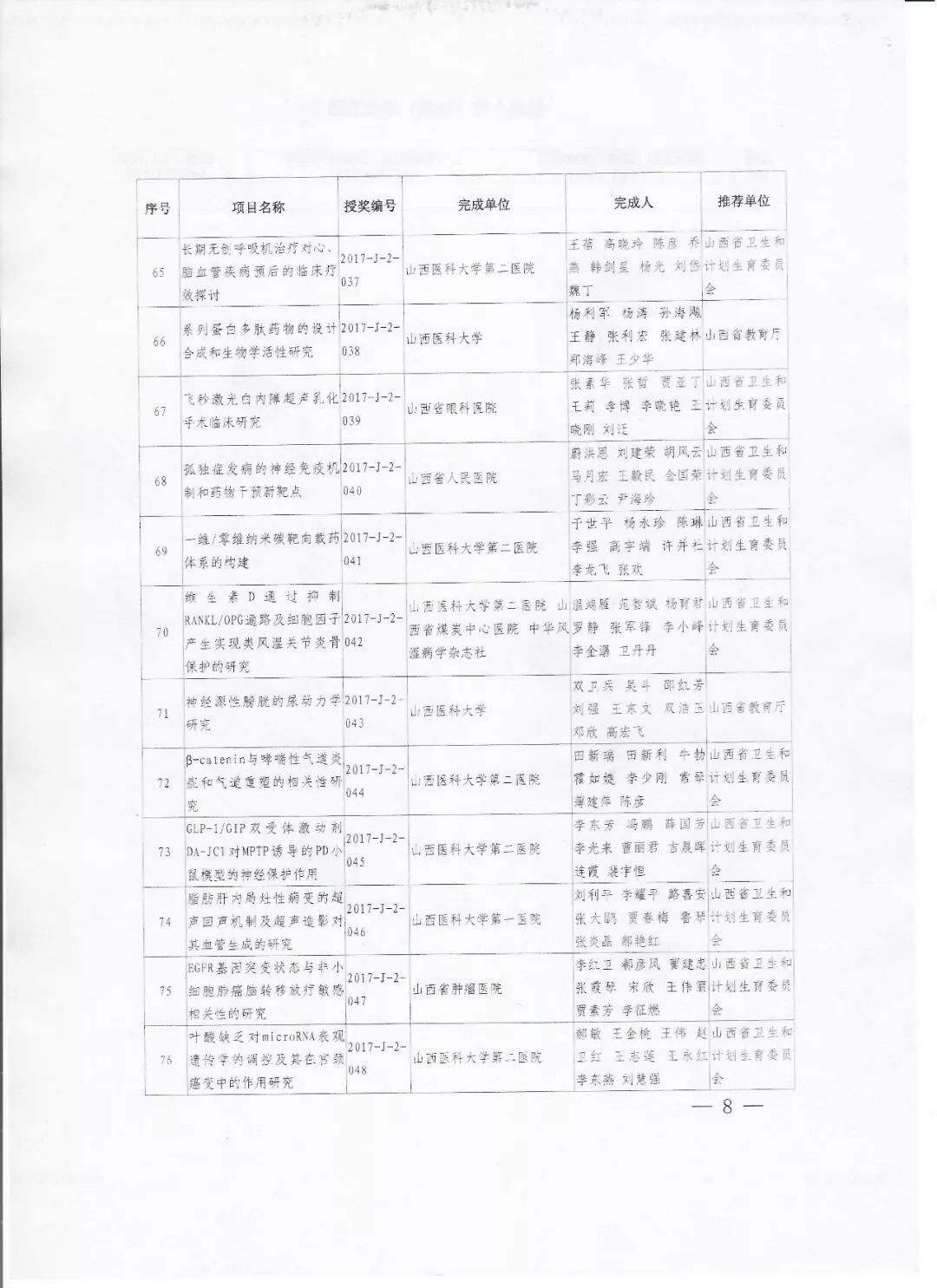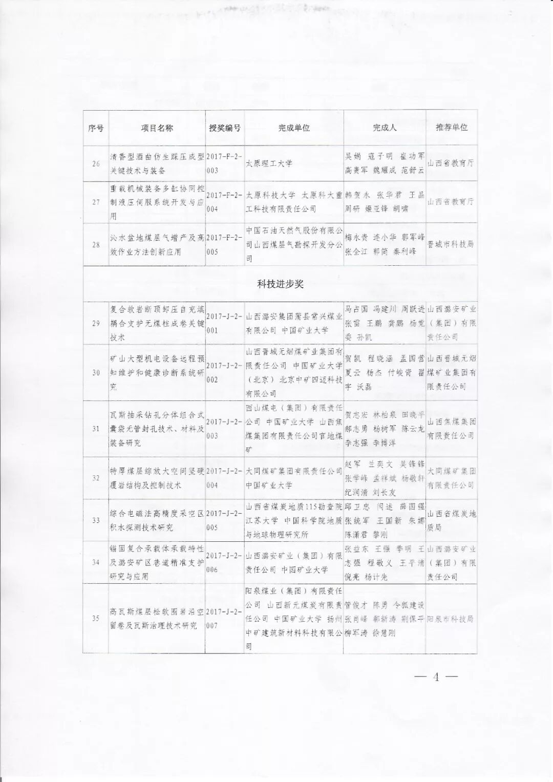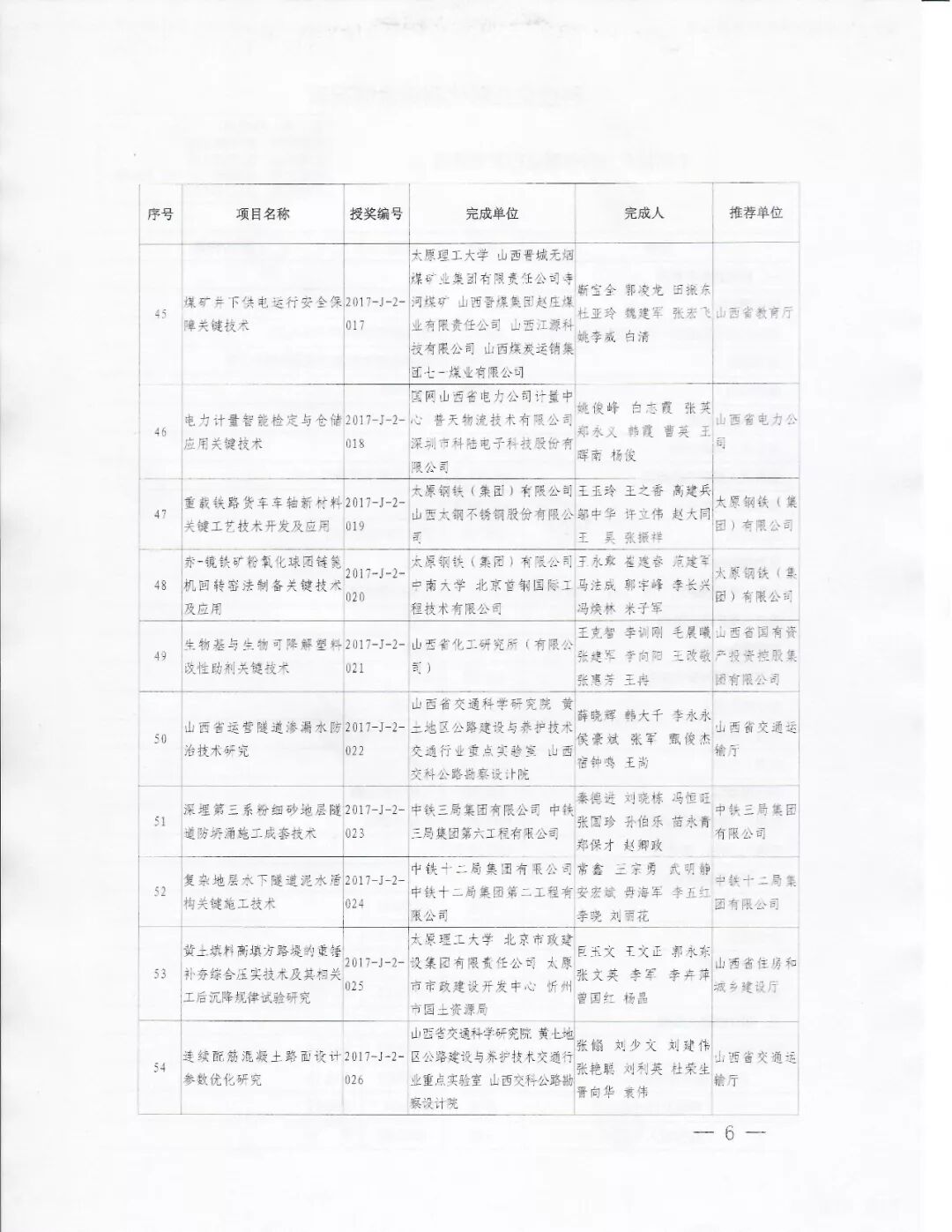 山西省人民政府 关于2017年度山西省科学技术奖励的决定